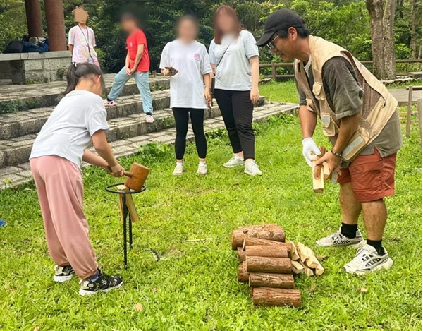 ii) 安全劈柴體驗: 與傳統使用斧頭劈柴不同,將柴枝固定在附有刀片的鐵架上,參加者使用木鎚敲打柴枝,達至劈柴效果。